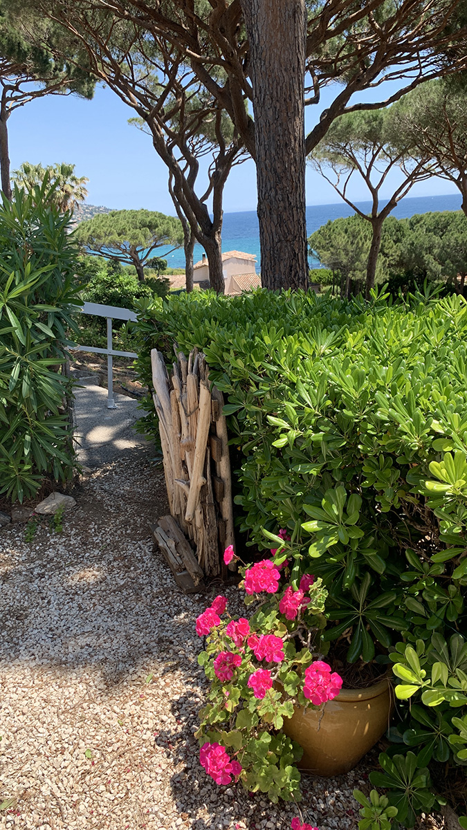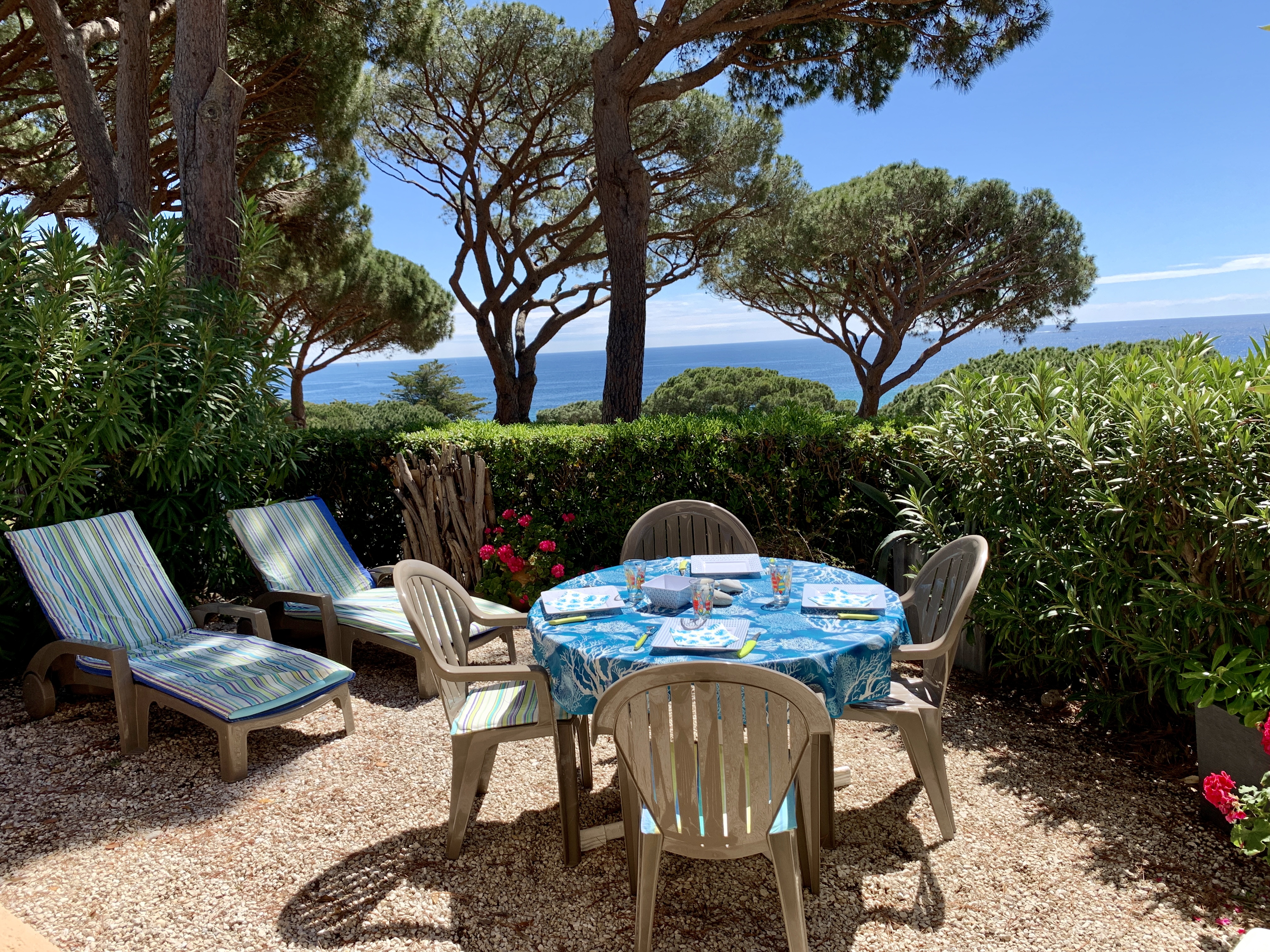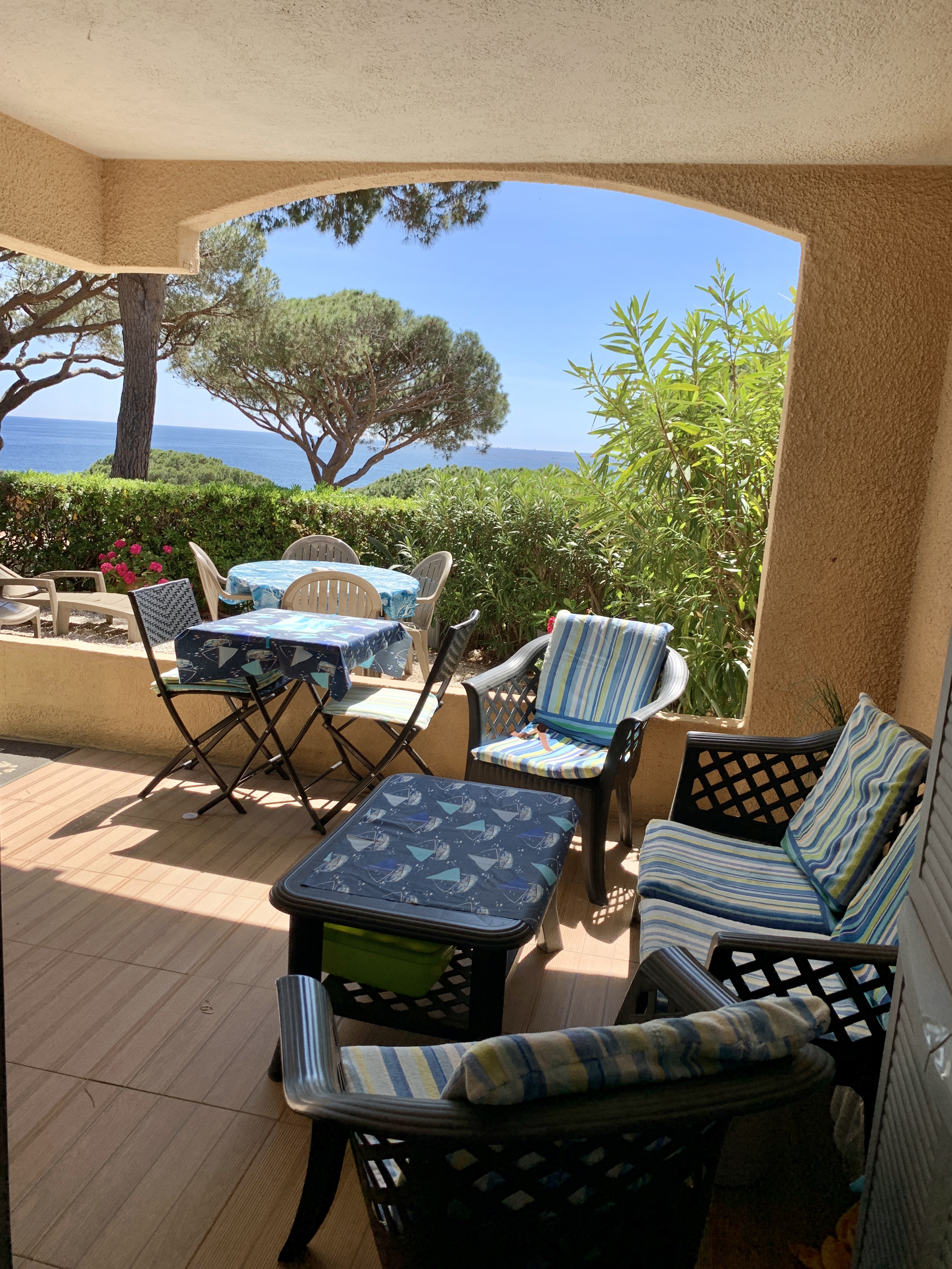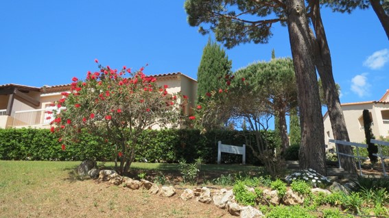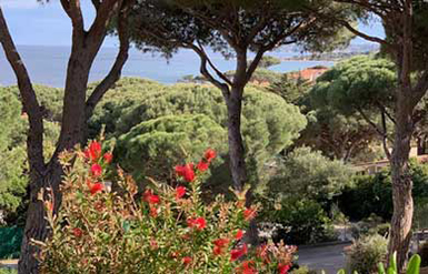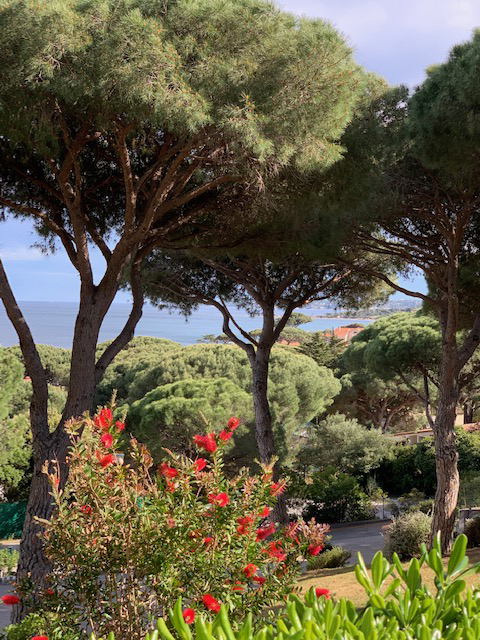 Petit paradis tout confort, en rez de jardin, vue mer, située à Sainte Maxime dans un domaine calme au milieu d'un jardin méditerranéen aux senteurs uniques du sud : pins parasols, lauriers fleuris, oiseaux de paradis, mimosas...