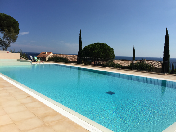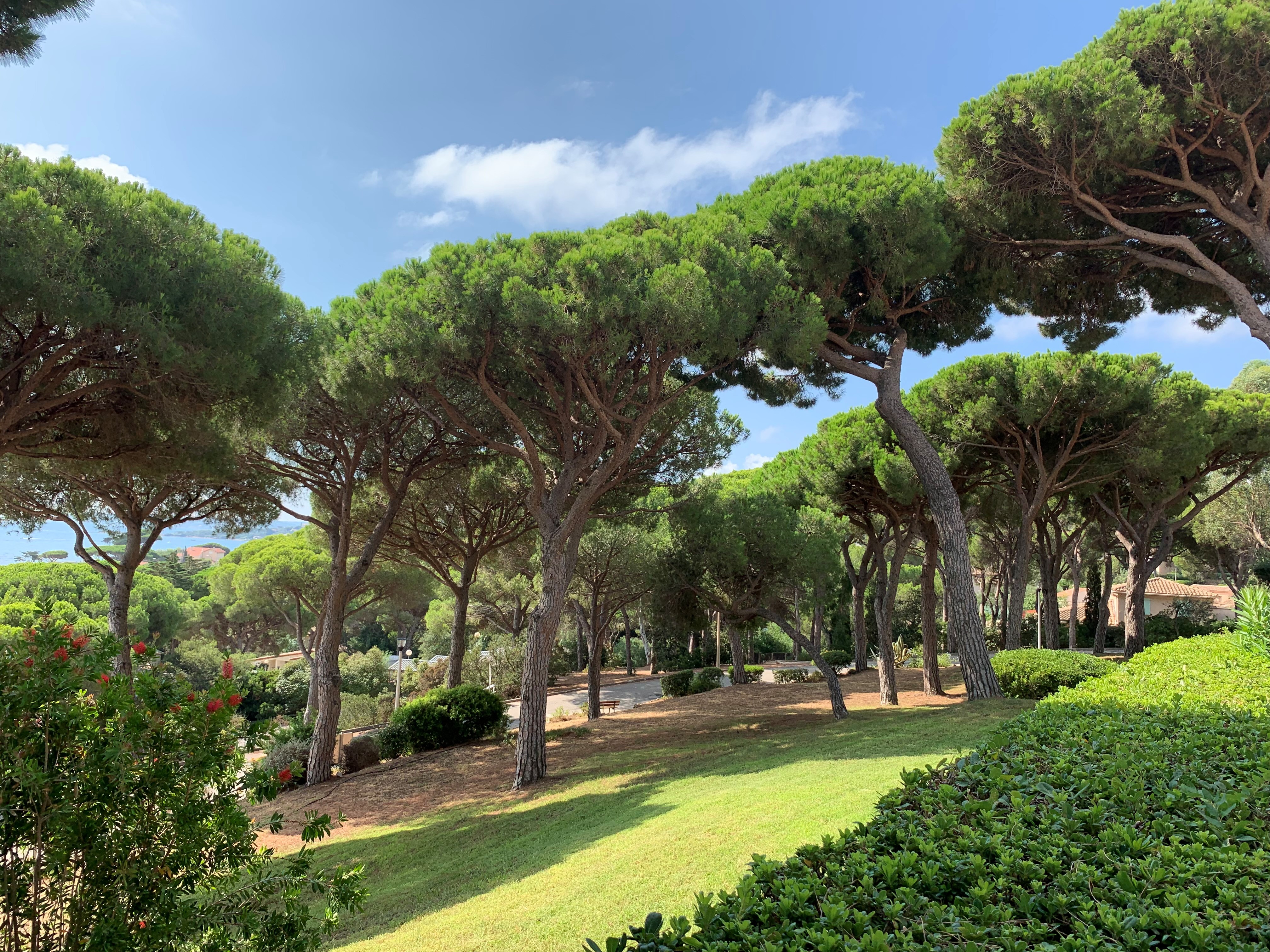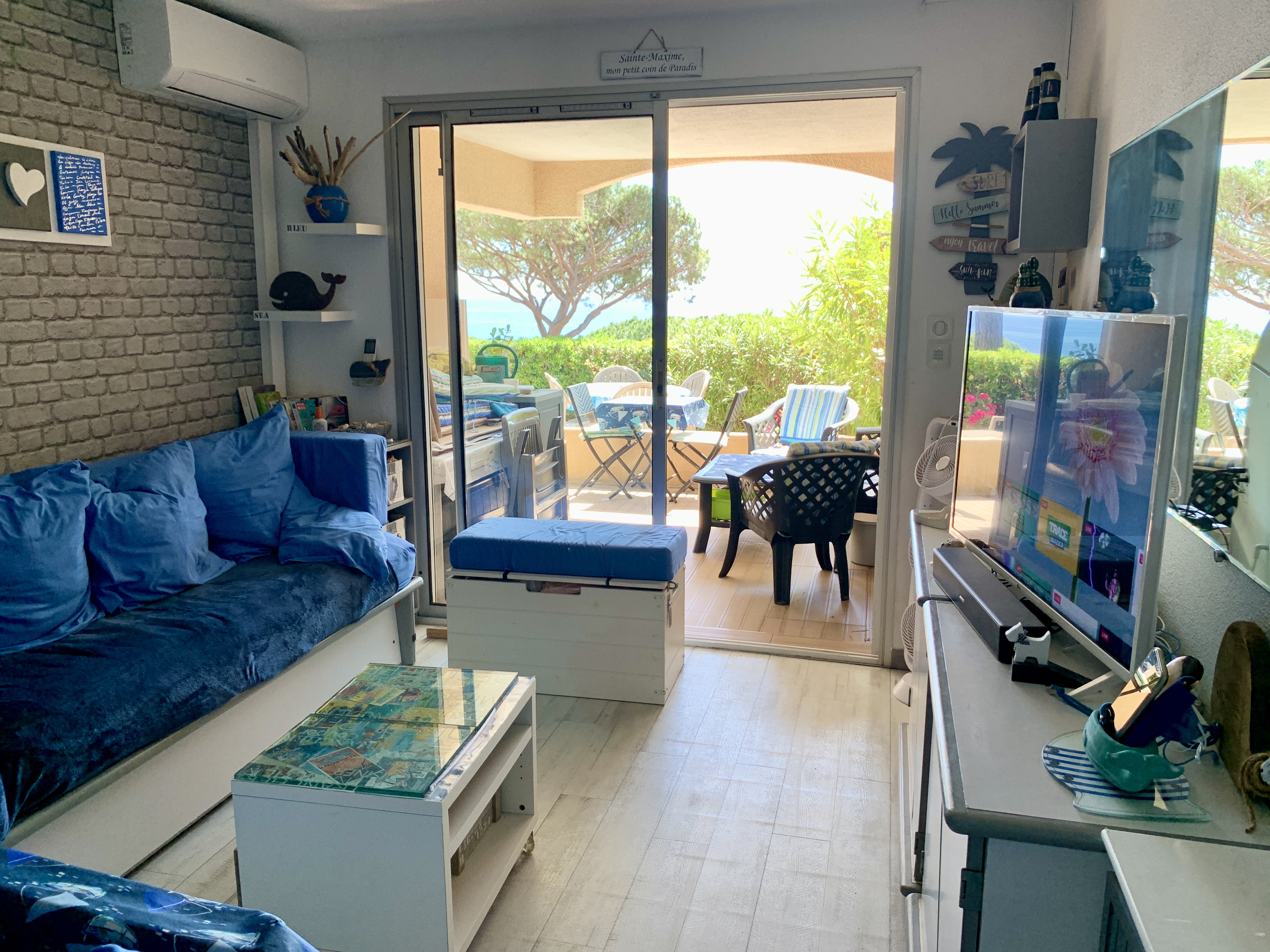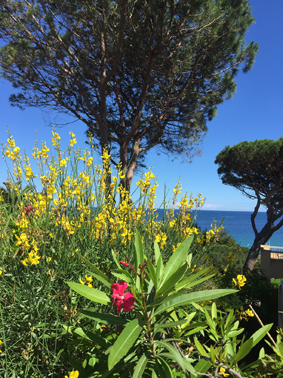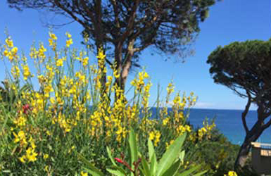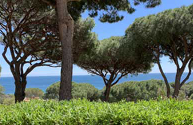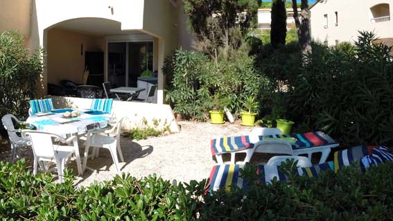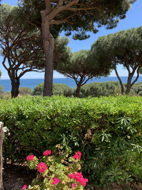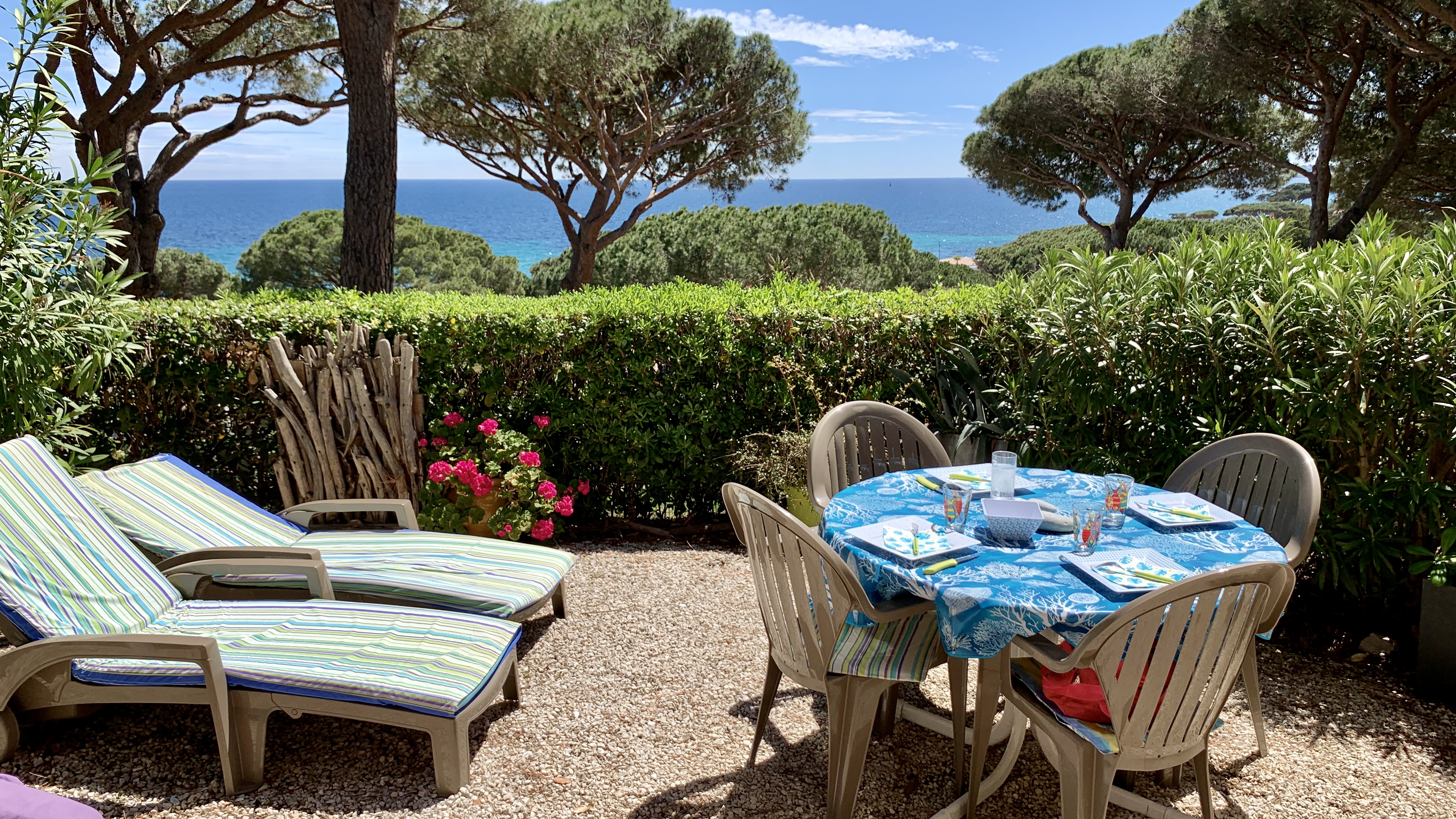 Petit paradis tout confort, en rez de jardin, vue mer, située à Sainte Maxime dans un domaine calme au milieu d'un jardin méditerranéen aux senteurs uniques du sud : pins parasols, lauriers fleuris, oiseaux de paradis, mimosas...
